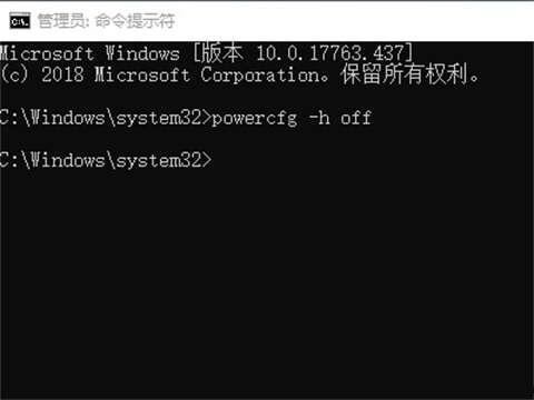 3、输入 powercfg -h off 命令